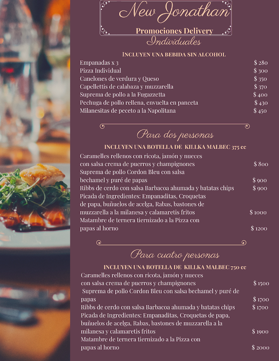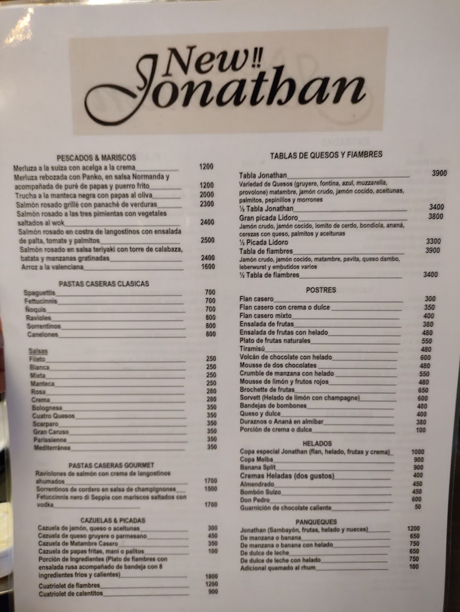 Welcome to New Jonathan, a culinary gem nestled in the vibrant streets of Buenos Aires at Av. Lidoro J. Quinteros 1200. This charming eatery combines warm hospitality with a menu that reflects the heart of Argentinian cuisine. Diners rave about the bacon-wrapped beef dressed in a luscious wine sauce, a true standout that delights the palate.